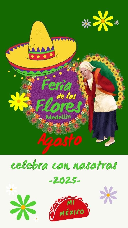 3. Estilo: Composición ilustrativa con elementos gráficos del folclore mexicano (sombrero) y la cultura paisa (silletera y flores) en un diseño vertical. La jerarquía se establece con el título del evento centrado en una corona floral.